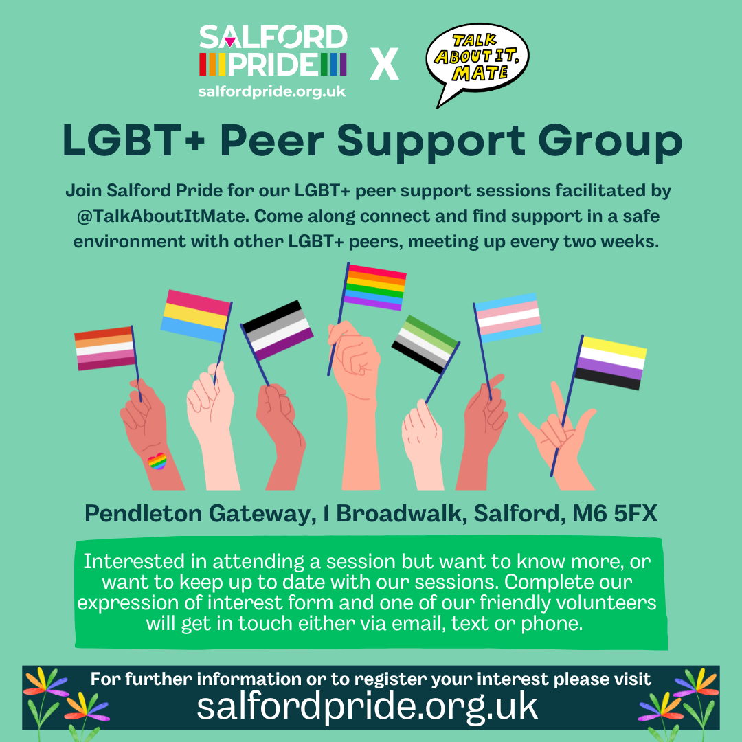Salford Pride have teamed up with @talkaboutitmate to continue our peer to peer support group sessions every two weeks from August 1st for the LGBTQ+ community here in Salford.